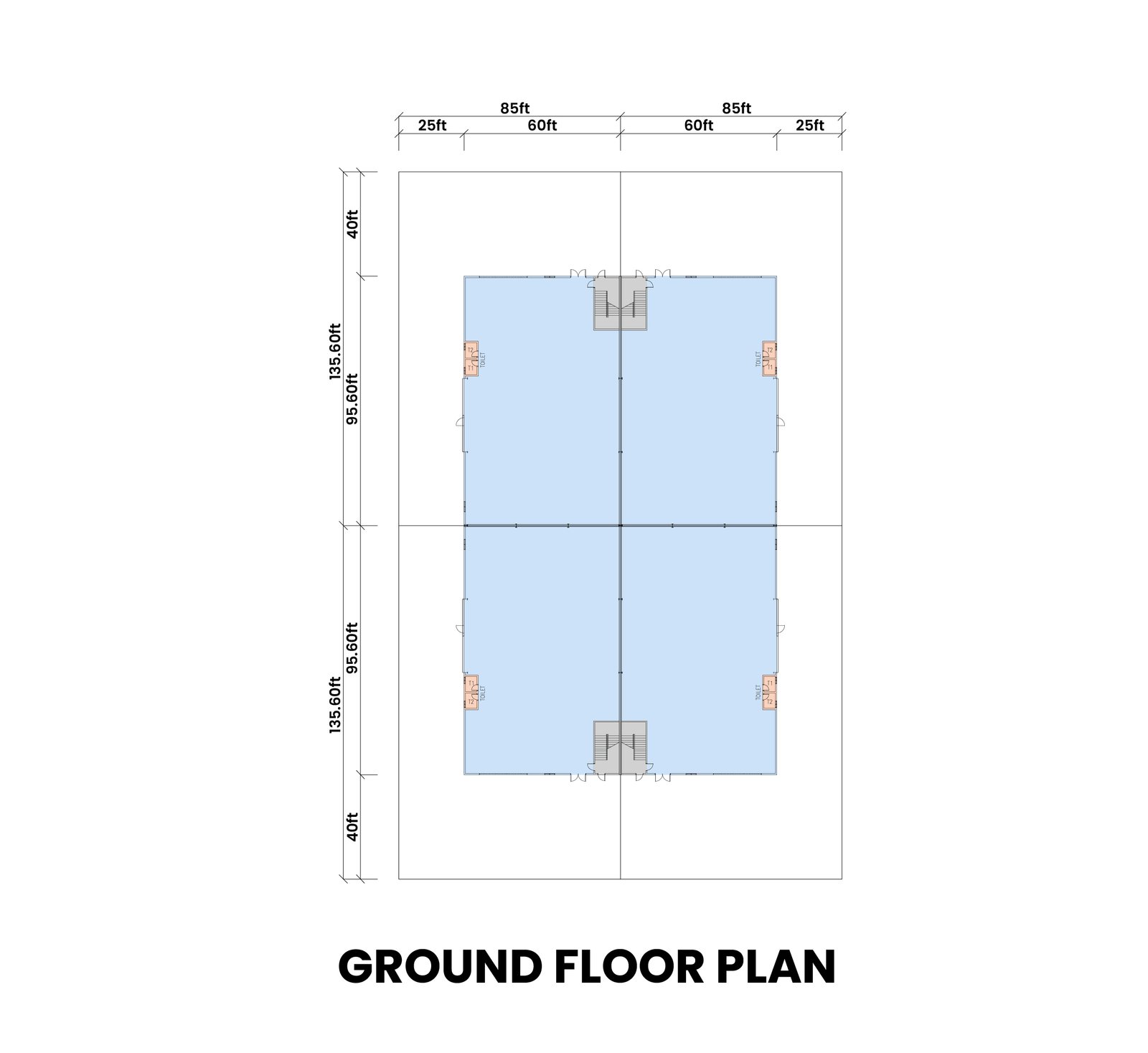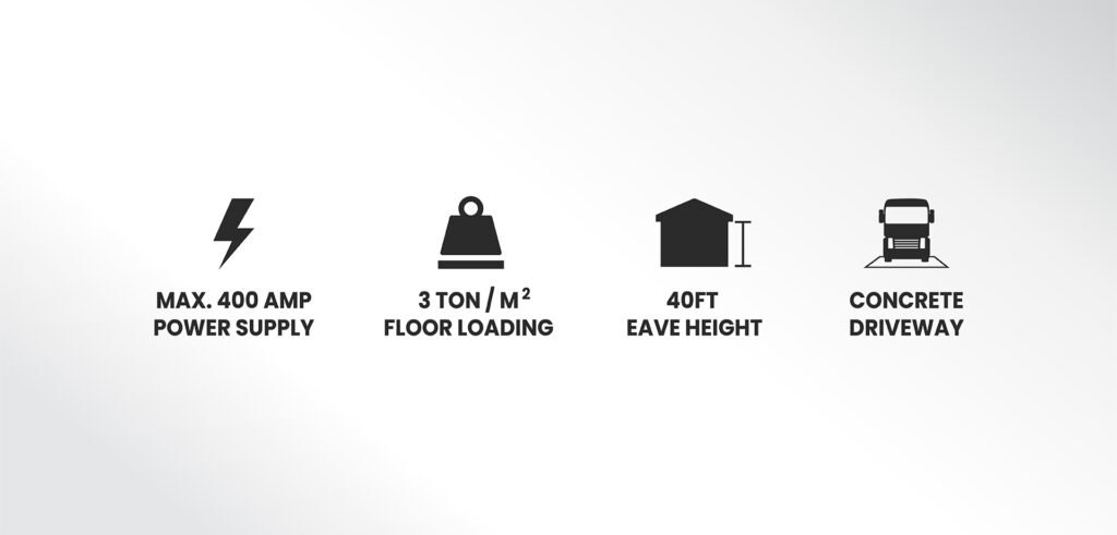 Class  A industrial standards, featuring robust 3‑ton/m² floor loading, 400 amp power supply, 40‑foot eave height, concrete driveways, and 6‑foot high full brick walls for durability and operational resilience.