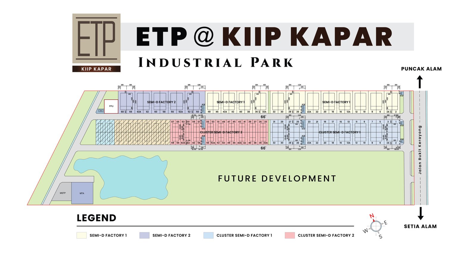 ETP @ KIIP Kapar is a modern industrial park designed for light and medium industrial use. Strategically positioned with excellent road connectivity, it offers semi-detached and detached factory units with wide roads, high ceilings, and spacious layouts, making it ideal for logistics, warehousing, and manufacturing businesses.