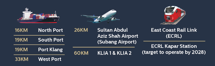 Strategically connected, the property is just 16–33KM from key ports and 26–60KM from major airports, ensuring smooth logistics for regional and international operations. Its value is further elevated by the upcoming ECRL Kapar Station, set to be operational by 2028, which will enhance accessibility and boost future growth prospects.